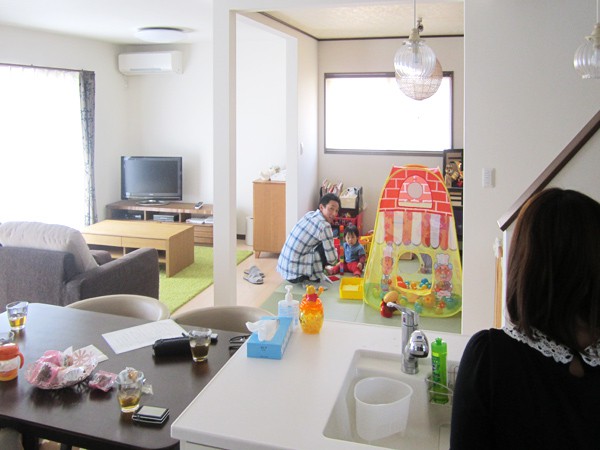 広いしやわらかい床にしたからタク(お子様)転んでも大丈夫だしね。むしろ転ばなくなったね、滑らないから。アパートではツルツルしてたけど…繋がってるからすぐ暖かい部屋に行けるし、すごいラク!