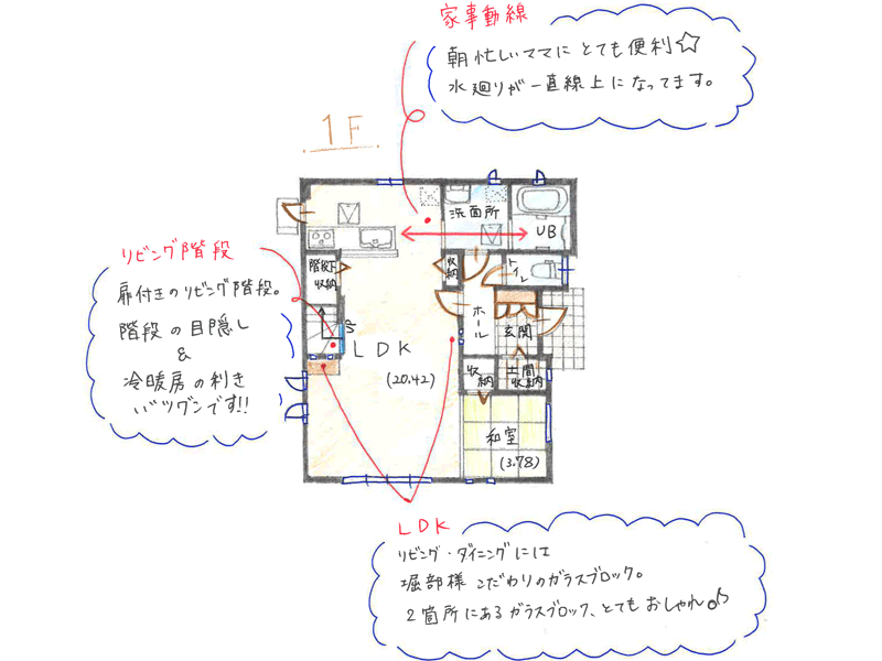 ガラスブロックをどうしても部屋の中に入れたくて、入れてもらいました。あとは、南道路なのでリビングを南に持ってきたかったです。玄関は靴履くとかなので、暗くてもいいかなと。