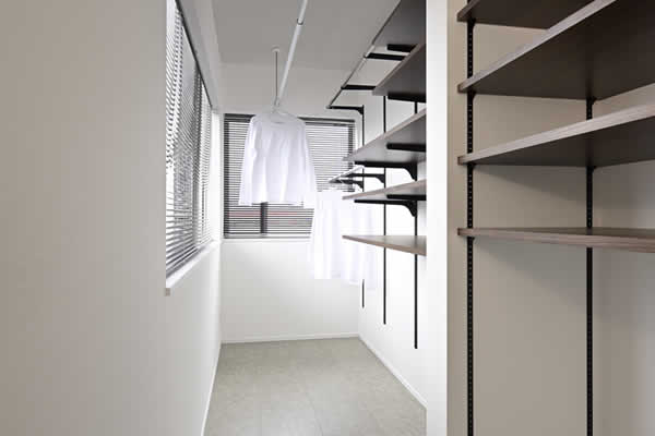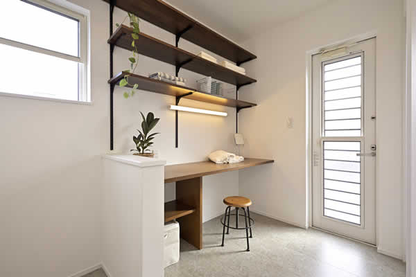 洗濯物を干す場所に困らないランドリースペース。棚もついているのでアイロン作業も楽々。