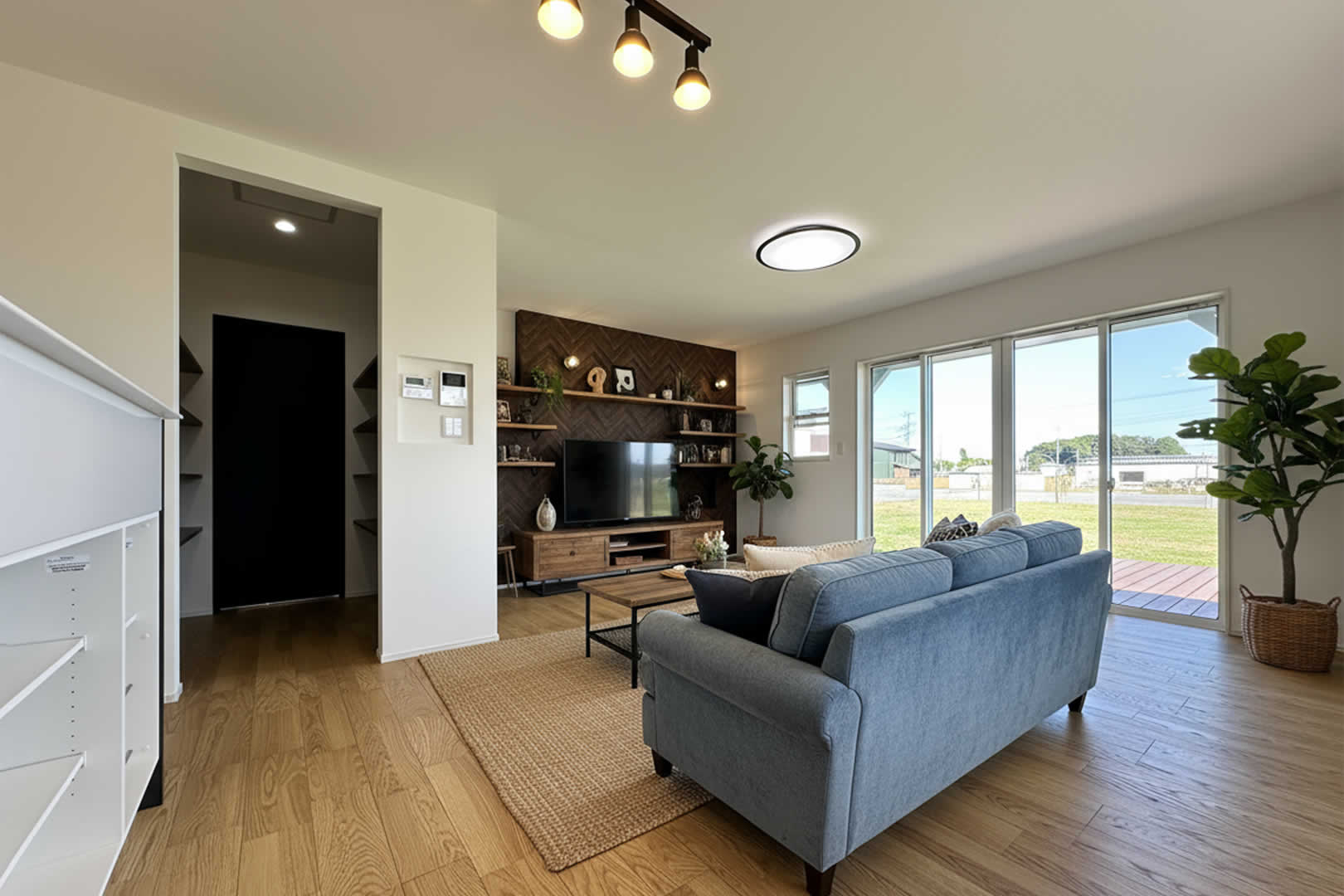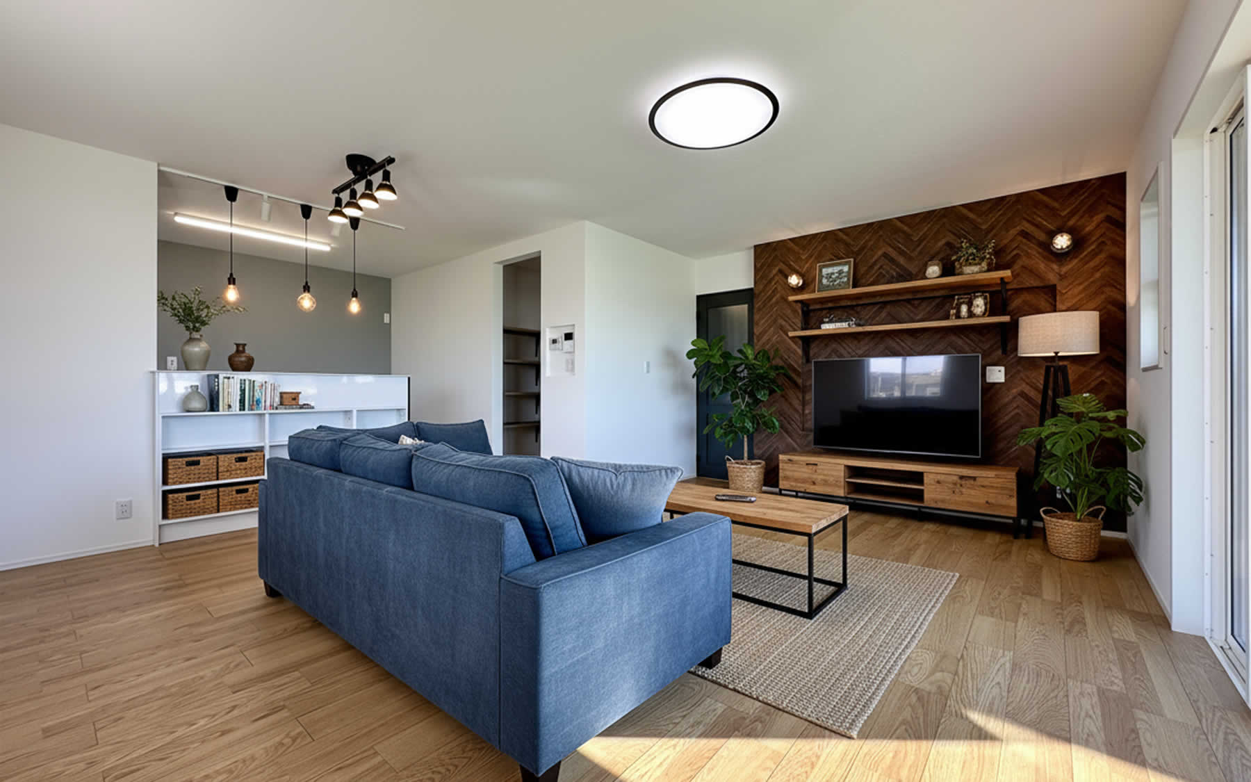 ダークブラウンのヘリンボーン柄が映えるLDK。落ち着いた雰囲気の中に、おしゃれなアクセントが光ります。