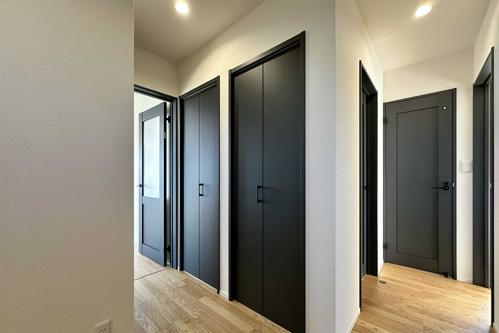 落ち着いた雰囲気の寝室。ブラックの収納が空間を引き締め、シンプルで大人っぽい印象に。