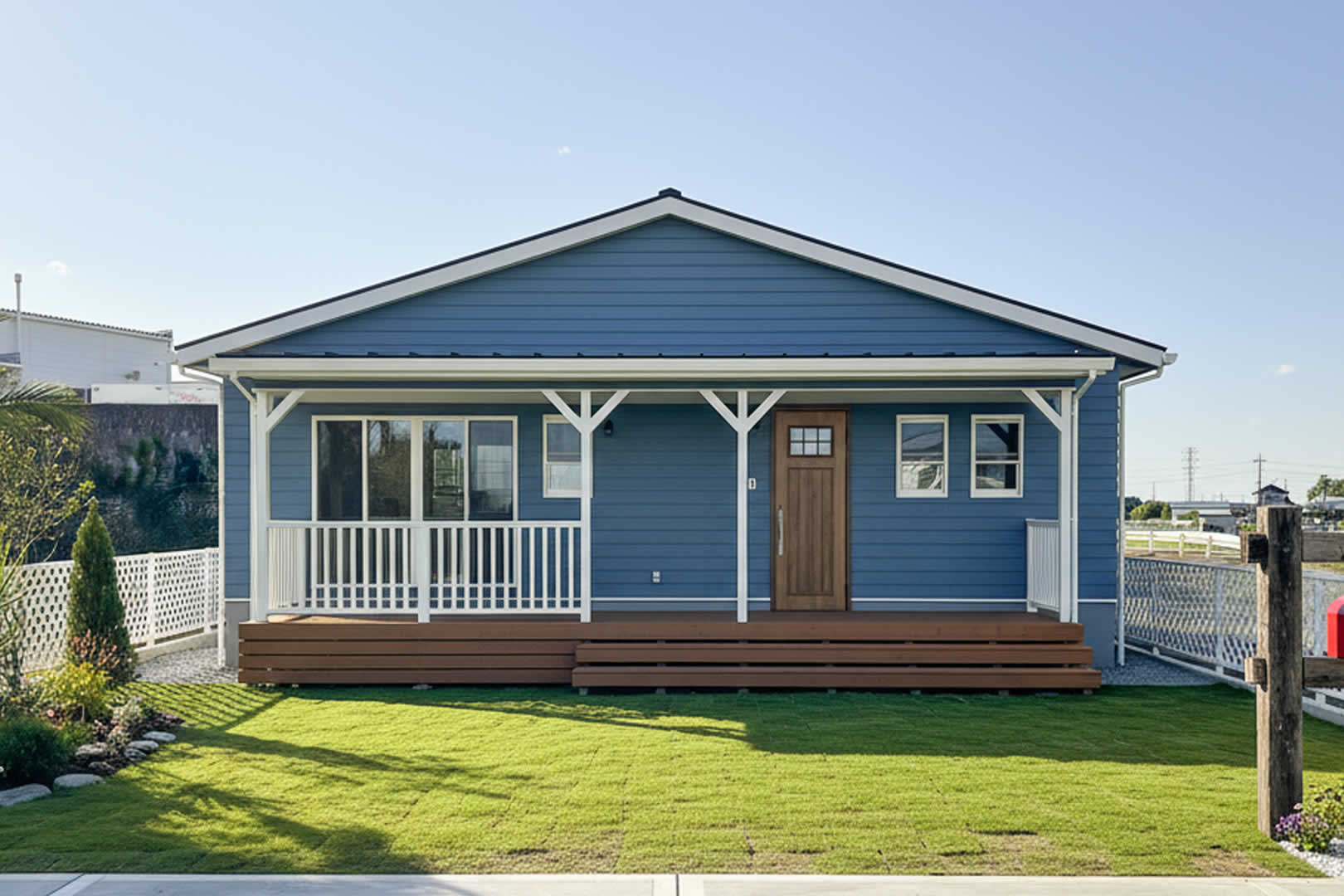 ペールブルーのラップサイディングが爽やかな印象。玄関は温かみのあるデザインで、カリフォルニアスタイルの平屋ならではの心地よさが感じられます。