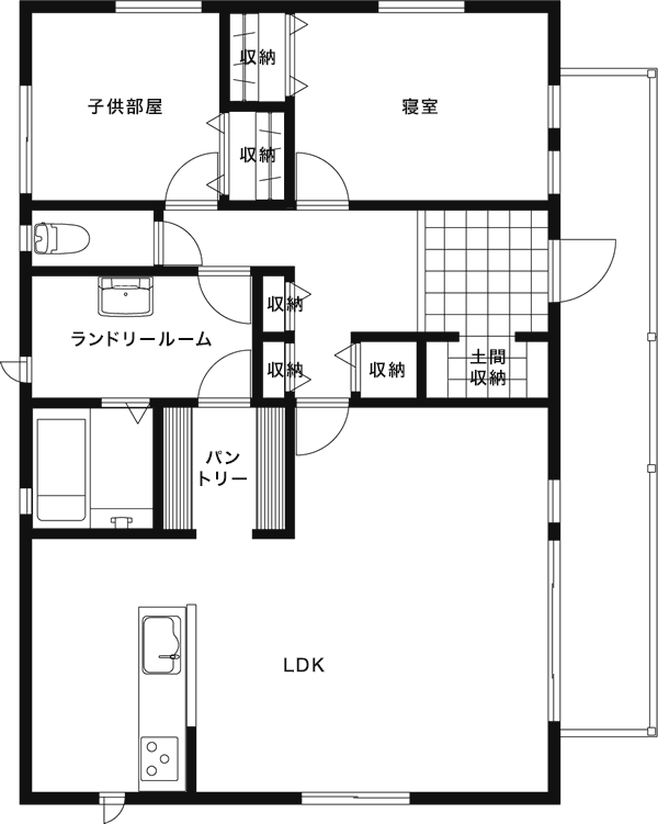 靴やアウトドア用品などをすっきり収納。玄関まわりをいつもきれいに保てる便利なスペースです。玄関からランドリールーム、パントリー、キッチンへ一直線で家事ラク動線に。