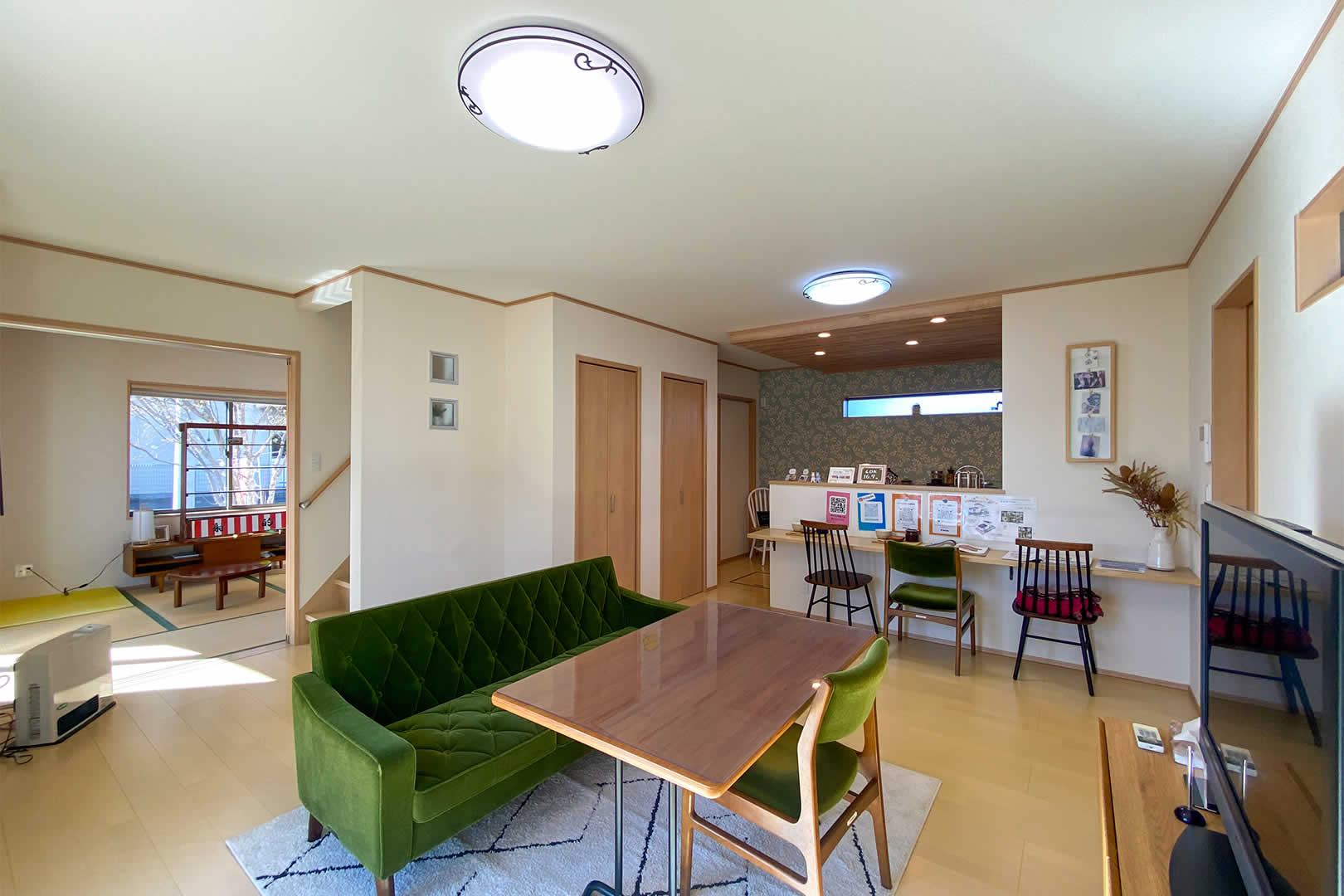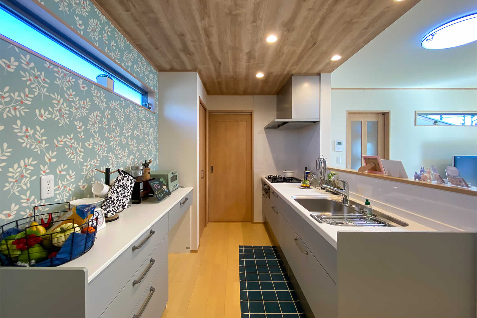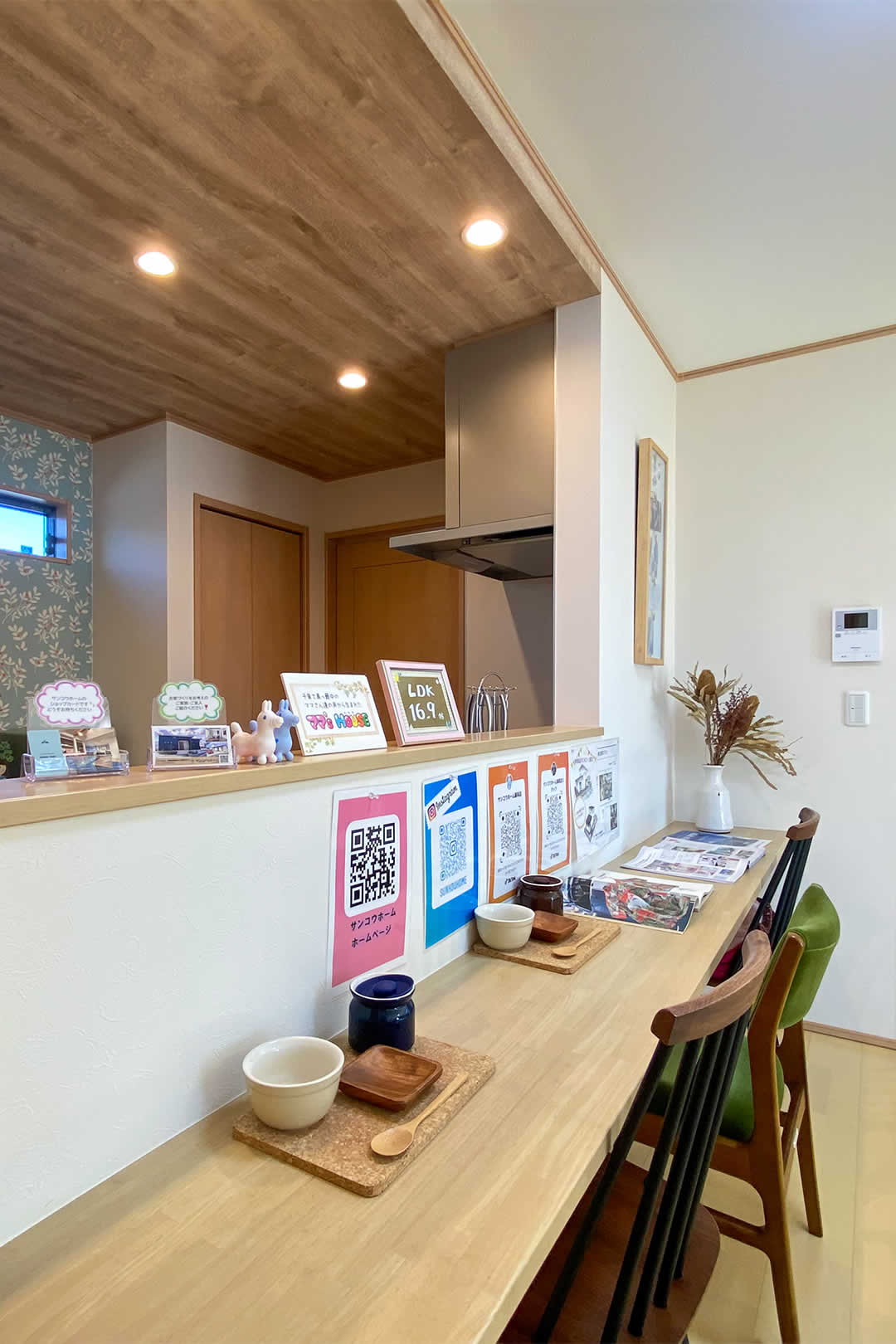 キッチンの裏はダイニングテーブルのかわりにカウンターを付け、食事はもちろん、お子様のお絵かき遊びやお勉強など家事をしながらママの目が届くようになっています。