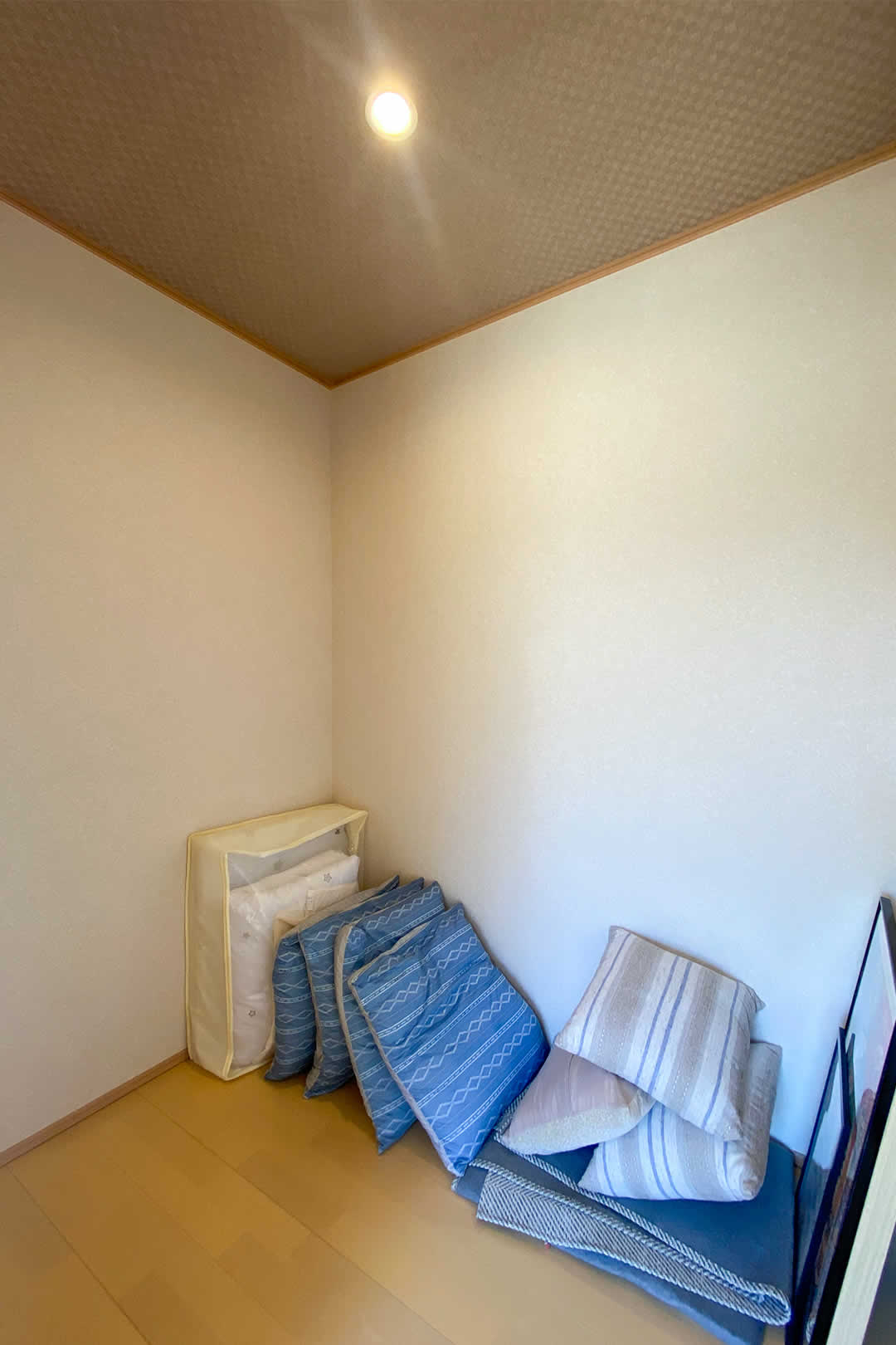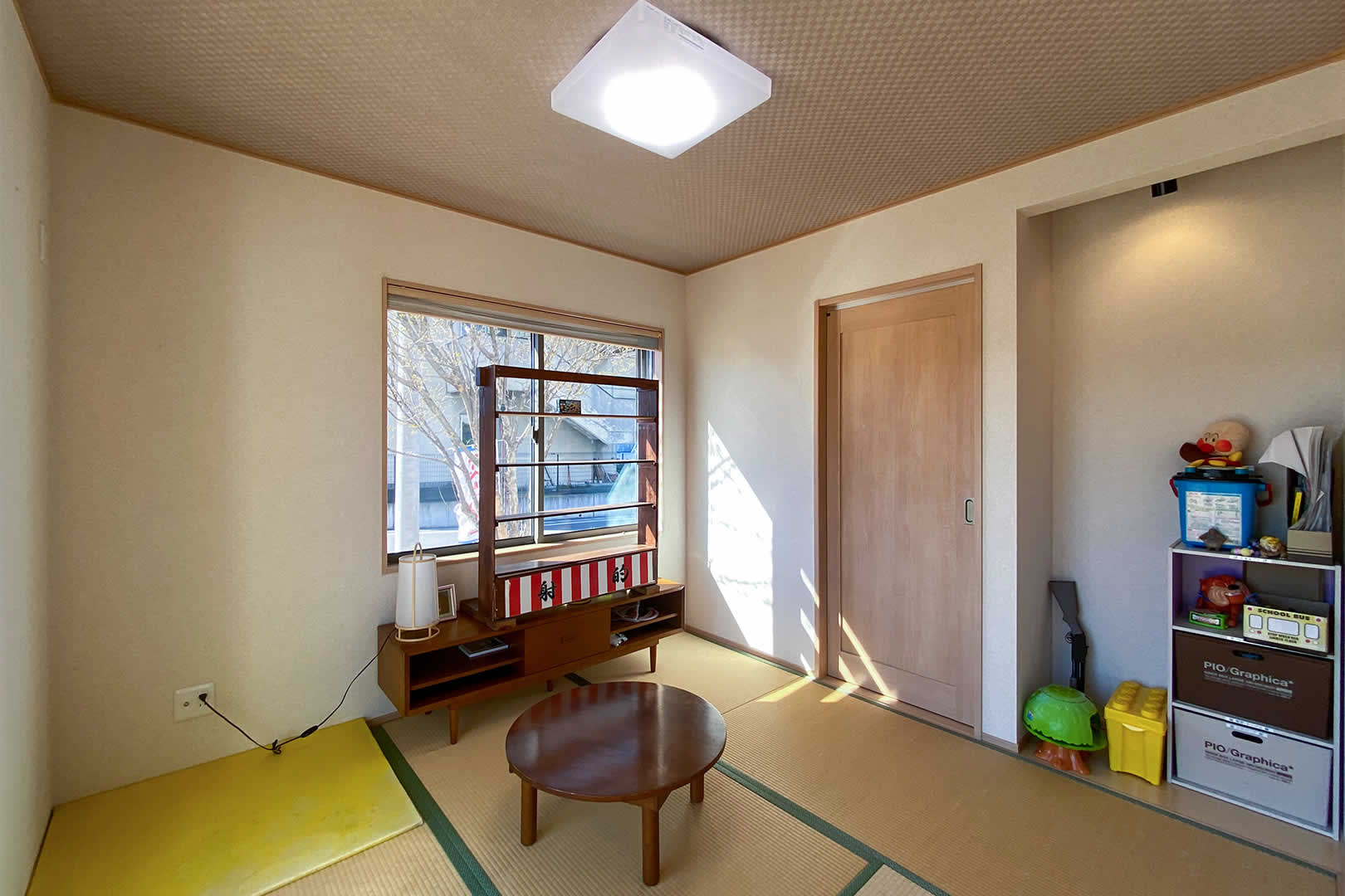 LDK横の和室は、お子様のおもちゃ遊びや、お昼寝、洗濯物の室内干し、客間など使い方いろいろです。1.8帖の収納もあり、お布団置き場として使えます。