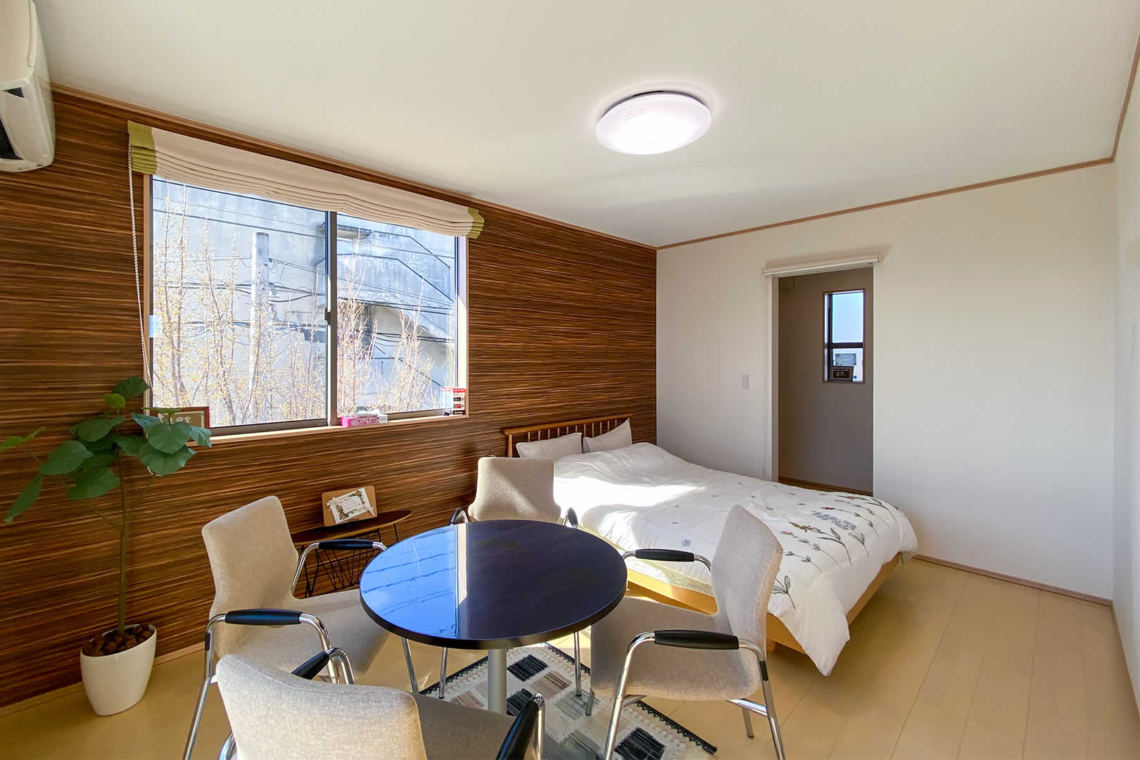 ダブルベッドを置いてもスペースに余裕があるのでテーブルやソファ、テレビを置いて充実させても良いですね。