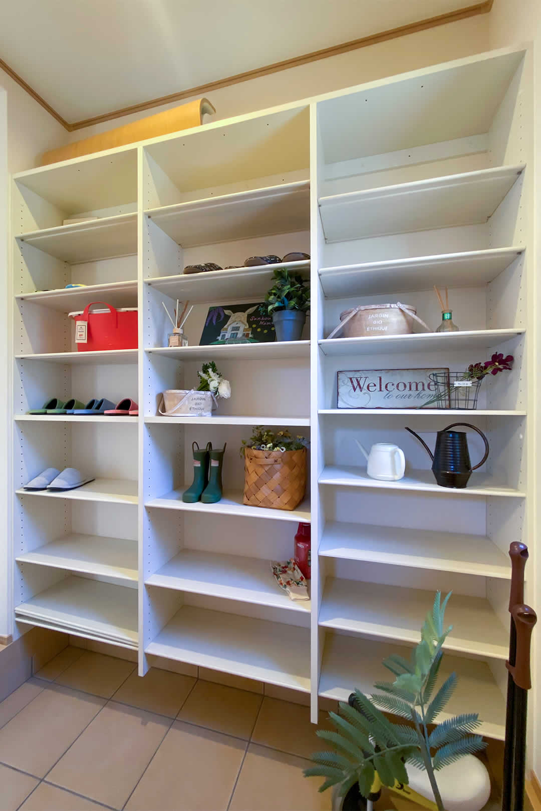 靴のまま簡単にアイテムの出し入れができるので外出時・帰宅時の流れがスムーズになります。靴だけでなく、趣味の園芸グッズなど必要なものも置けます。
