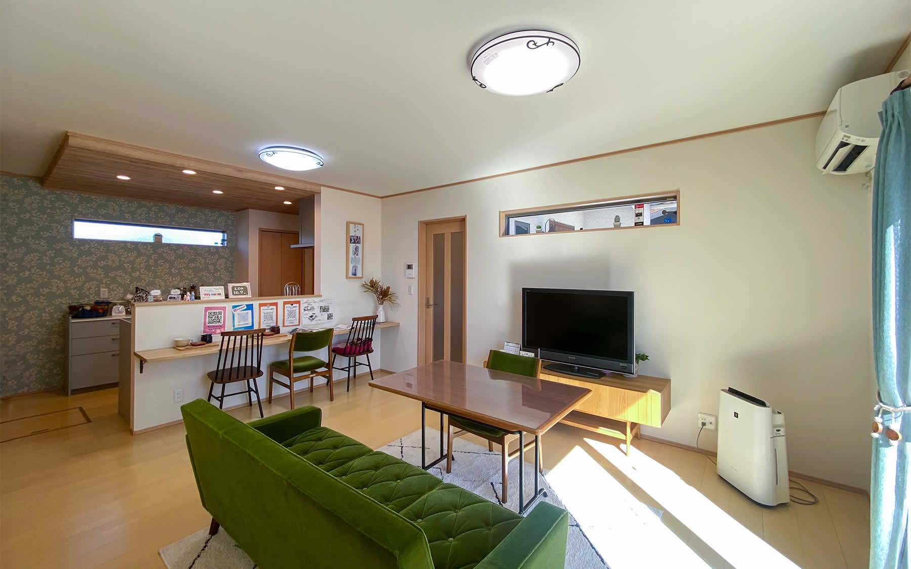 キッチンスペースを下がり天井にすることで、リビングとキッチンがメリハリのある空間になります。木目調のクロスもオシャレです。