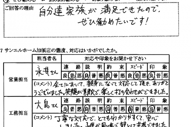 ぜひ勧める。自分達家族が満足できたのでぜひ勧めたいです!
