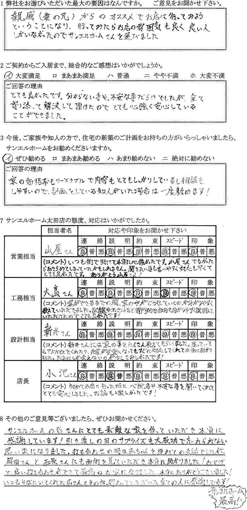 親戚(妻の兄)からのオススメでお店に行ってみようということになり、行ってみたらお店の雰囲気も良く良い人しかいなかったのでサンエルホームさんを選びました。