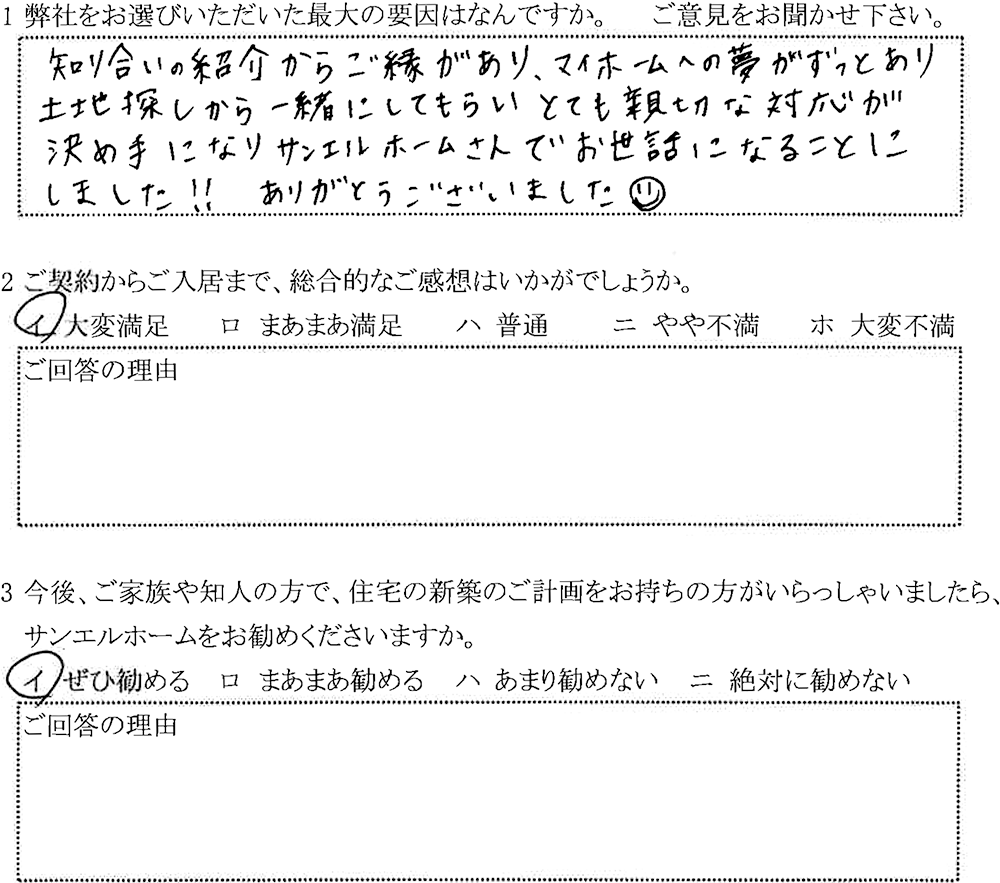 知り合いの紹介からご縁があり、マイホームへの夢がずっとあり、土地探しから一緒にしてもらい、とても親切な対応が決め手になり、サンエルホームさんでお世話になることにしました!!ありがとうござました(^-^) 契約から入居まで総合的な感想は?