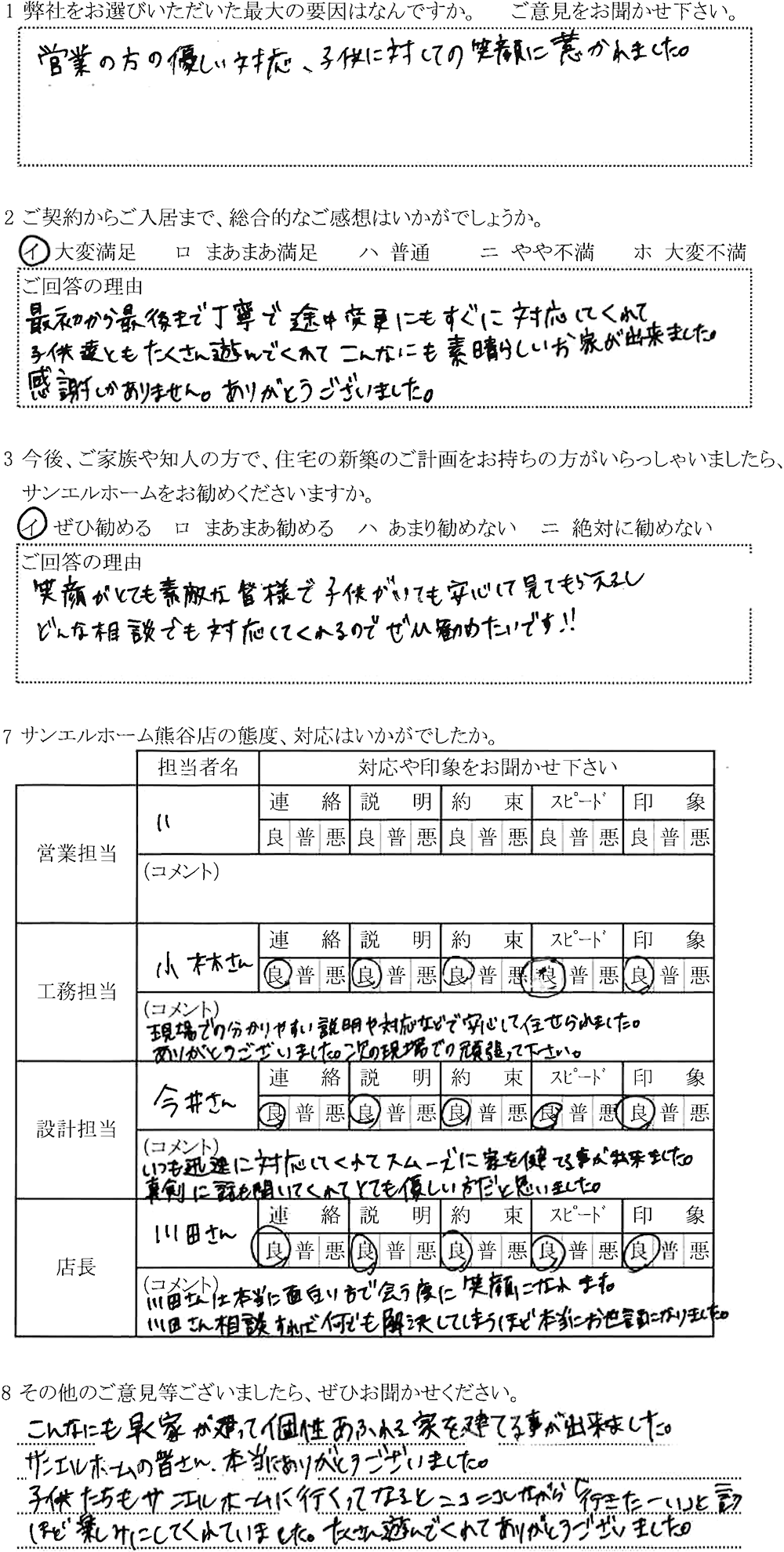 いつも迅速に対応してくれてスムーズに家を建てることができました。真剣に話も聞いてくれてとても優しい方だと思いました。