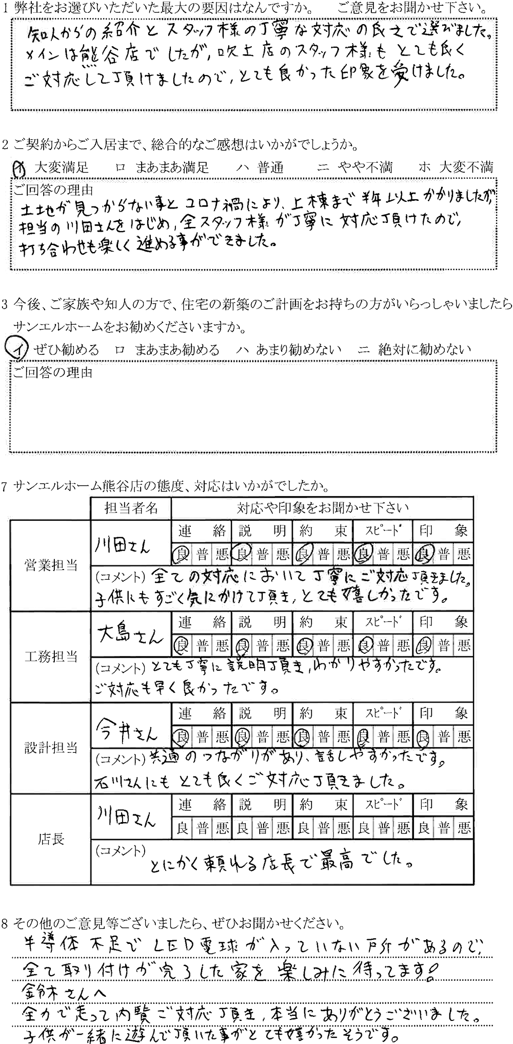 土地が見つからない事とコロナ禍により、上棟まで半年以上かかりましたが担当の川田さんを始め、全スタッフ様が丁寧に対応頂けたので、打ち合わせも楽しく進めることができました。