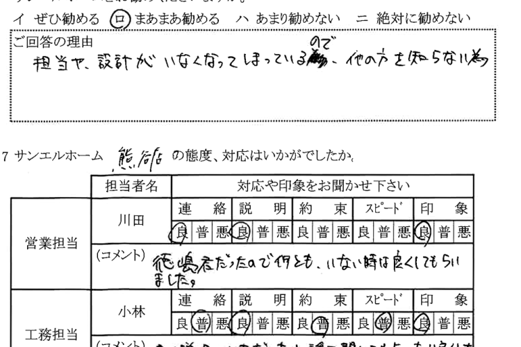 良く説明していただいたり話を聞いてもらったり良かったのですが、半年点検の報告を受けてません。それだけが残念です。