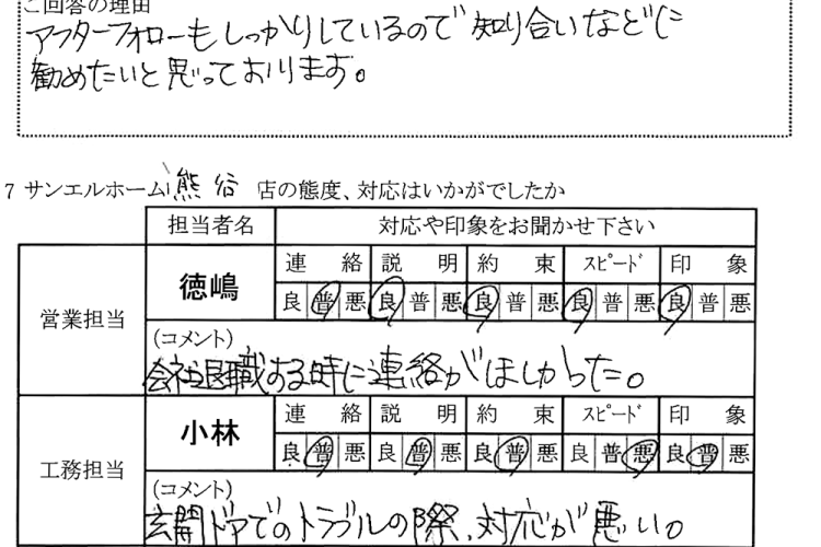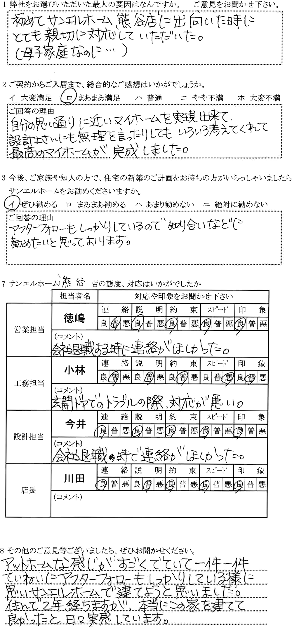 初めてサンエルホーム熊谷店に出向いた時にとても親切に対応していただいた。(母子家庭なのに…)