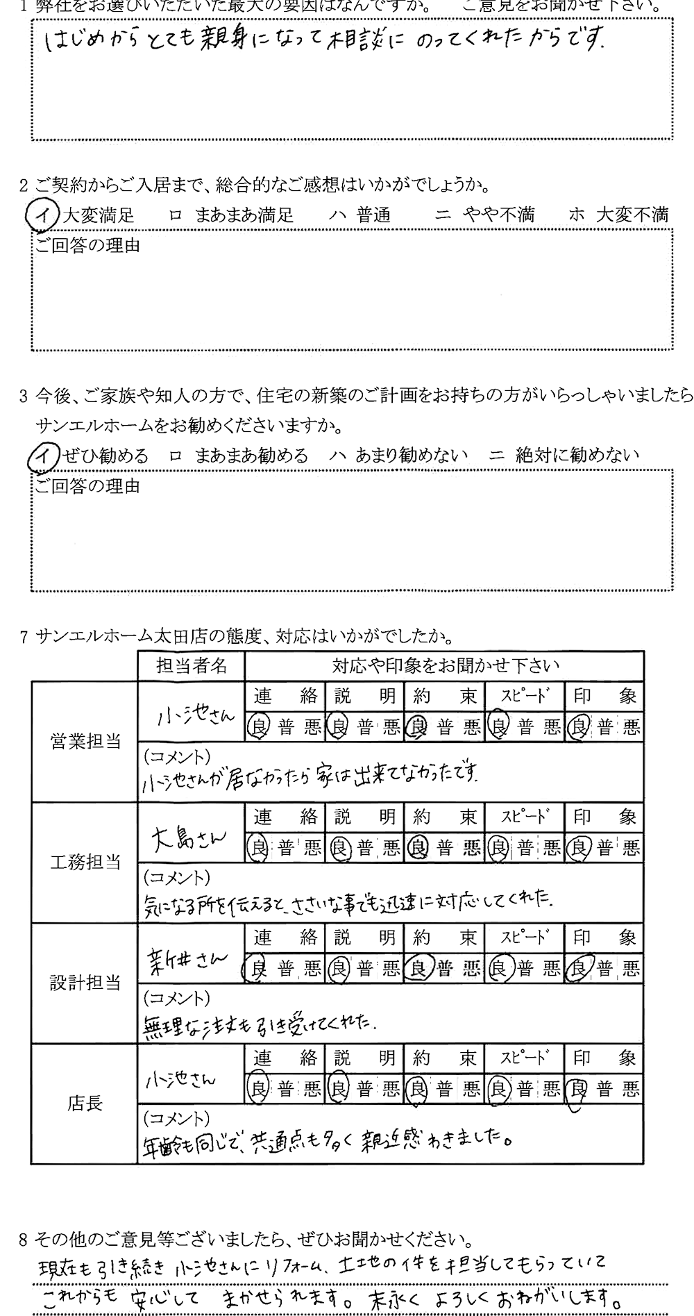 現在も引き続き小池さんにリフォーム、土地の件を担当してもらっていて、これからも安心して任せられます。末永くよろしくお願いします。
