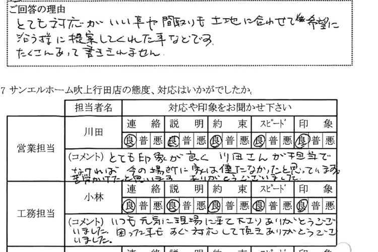とても印象が良く、川田さんが担当でなければ今の場所に家は建たなかったと思っています。苦労かけたと思います。ありがとうございました。