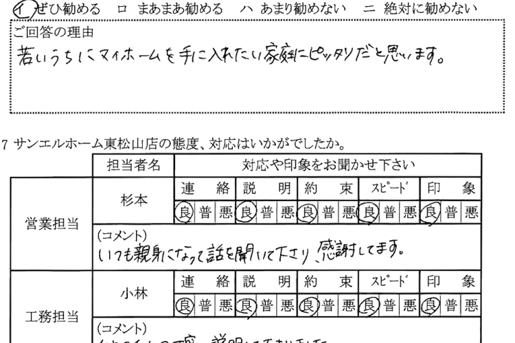 スタッフの皆さんの対応も丁寧で気持ちが良かったです。そしてなにより「幸せづくりの診断書」がわかりやすく、マイホームを持つことをリアルに想像しやすかったです。