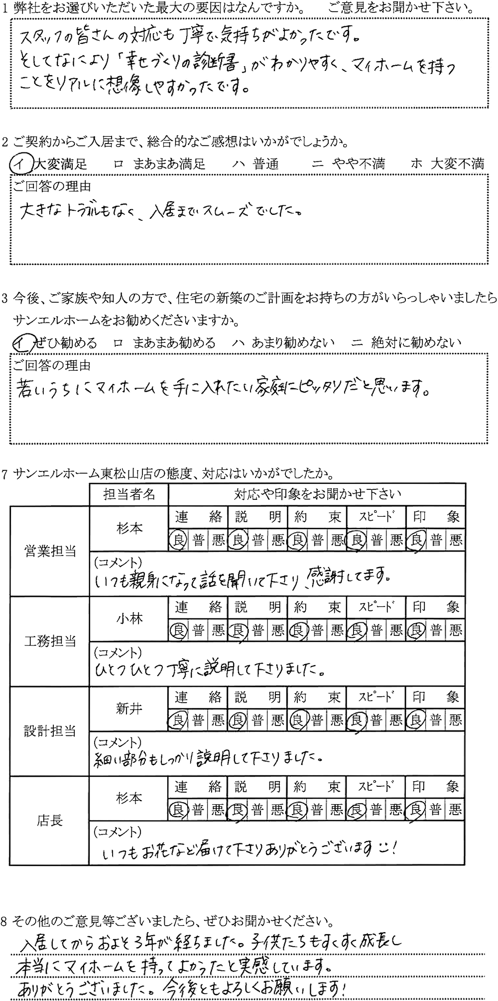 入居してからおよそ3年が経ちました。子供達もすくすく成長し本当にマイホームを持って良かったと実感しています。ありがとうございました。今後ともよろしくお願いします!